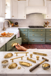 Elegant kitchen featuring sage green cabinets with brass cabinet hardware including knobs and drawer pulls on a marble countertop